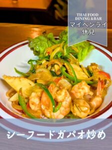 マイペンライ伏見では、シーフードガパオ炒めを提供しています。この料理は、旨辛さとホーリーバジルの爽やかな香りが特徴であり、一度食べればやみつきになること間違いありません。