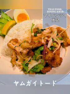 マイペンライ 伏見店では、本場タイの味を再現したヤムガイトードを存分に楽しむことができます。店内の雰囲気は落ち着いた雰囲気で、ゆったりとしたテーブル席が用意されています。ランチやディナーの営業時間も幅広く、友人や仲間との食事に最適です。ヤムガイトードは、ヘルシーな食材を使用しているため、スタッフおすすめの一品です。爽やかなハーブの香りと辛さと酸味のバランスを堪能してみてはいかがでしょうか。