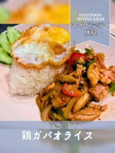マイペンライ 伏見店では、鶏のガパオライスもご用意しています。バジルの香りとスパイスが効いた旨辛タイ料理です。鶏肉の旨みとジューシーさが特徴で、ご飯との相性も抜群です。
