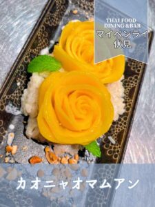 カオニャオマムアンは、もち米とマンゴーの素材の魅力を存分に引き出した、タイのデザートの至宝です。伝統と現代の融合が生み出すこの絶品スイーツは、心も体も満たしてくれる特別な味わいを楽しむことができます。当店でぜひ、この贅沢なデザートをご賞味ください。