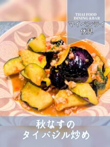 マイペンライでは、期間限定で秋茄子のタイバジル炒めをご提供しております。秋の旬の食材を使用し、タイの香り豊かなバジルと絶妙に組み合わせた料理は、一度食べたらやみつきになること間違いありません。