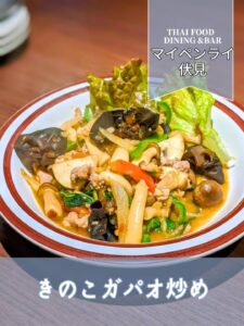 きのこガパオ炒めはピリ辛ながらも食べやすい辛さであり、一度食べるとその旨辛さに虜になること間違いありません。調和された香辛料と旨味が口の中に広がり、独特の満足感をもたらします。期間限定メニューのご提供もあと僅か、是非この機会にご賞味ください。