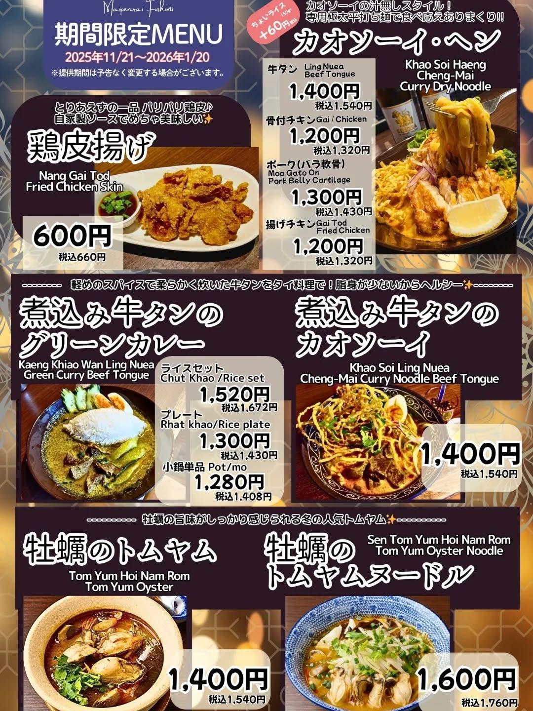 今回は、牛タンを使用したグリーンカレーやカオソーイ、前回人気だったカオソーイヘン、鶏皮唐揚げなど、充実のラインナップ!