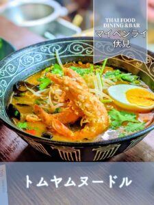 当店、「THAIFOOD DINING&BAR マイペンライ 伏見店」では、本格的なタイ料理を提供しております。その中でも、定番で人気のあるトムヤムヌードルは、スパイシーで酸っぱいトムヤムスープが特徴です。新鮮なヌードルが良く合い、食欲を刺激する一品となっております。