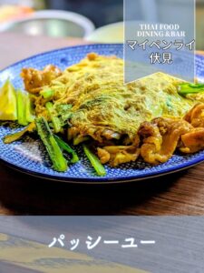 パッシーユーは、幅広の米麺(センヤイ)を甘みのある黒しょうゆで炒めた麺料理です。