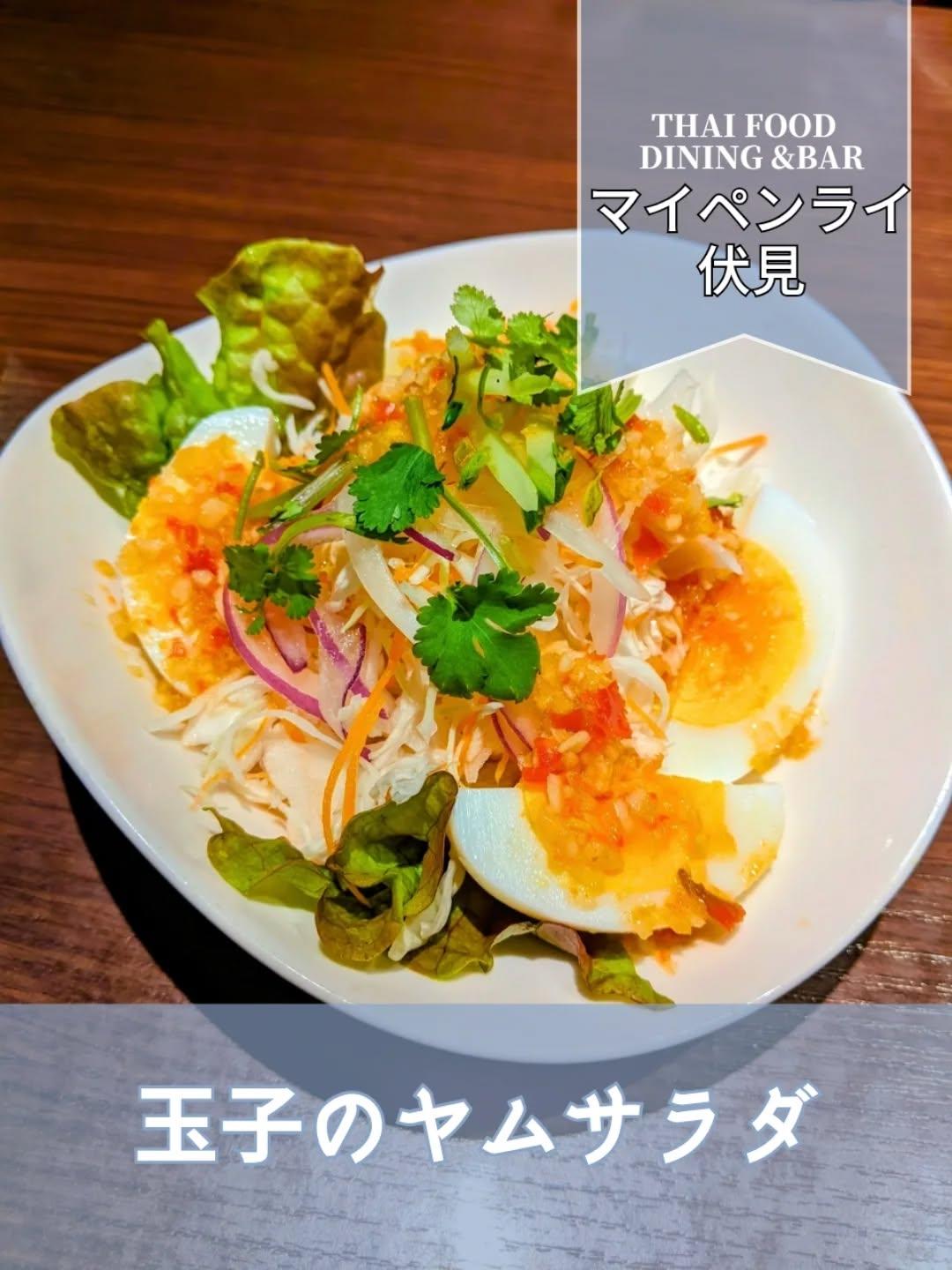 マイペンライ 伏見店では、玉子のヤムサラダが提供されています。このサラダは、本場タイ料理の酸っぱ辛い風味を存分に楽しめる一品です。玉子のまろやかさとヤムサラダのスパイシーさが絶妙にマッチし、ついつい箸が止まりません。