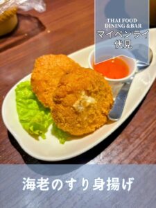THAIFOOD DINING&BAR マイペンライ 伏見店では、手作り海老のすり身揚げが絶品です。新鮮な海老を使用し、繊細な手仕事で作られたすり身は、サクサクの食感と濃厚な旨みが特長です。一口食べれば、タイ料理の魅力が存分に広がることでしょう。